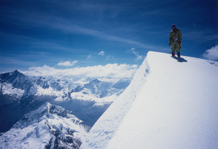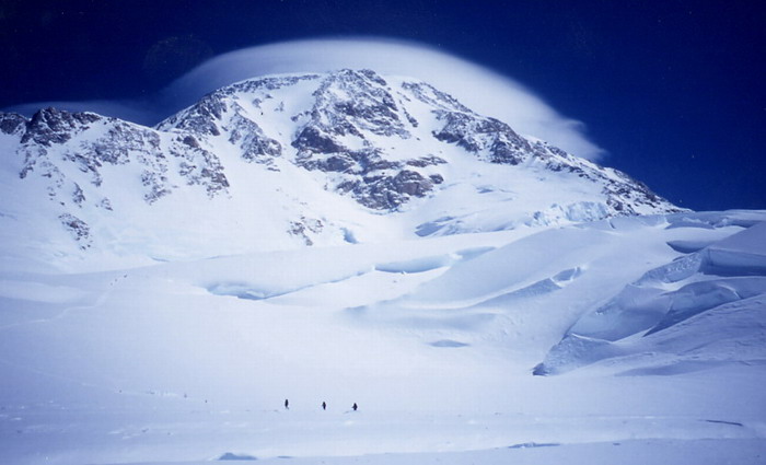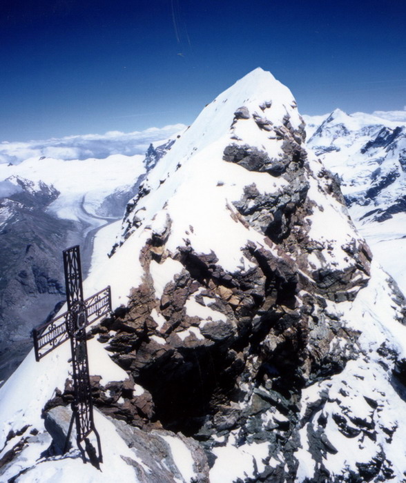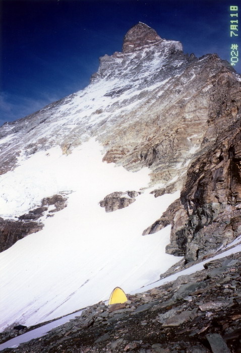![]() マッターホルン ヘルンリキャンプ ヒマラヤで登攀をやるならマッターホルンくらい一人で登っておかなくてはと思った。 ![]() マッターホルン頂上 4400m 降雪の直後でBCから新雪深く苦しいラッセルだった。頂きまで一人でトレースを引く感慨深い登頂となった。 登り9時間下り6時間で充実爽快な登山だった。 翌日から再びの下り坂でツムット稜は断念。