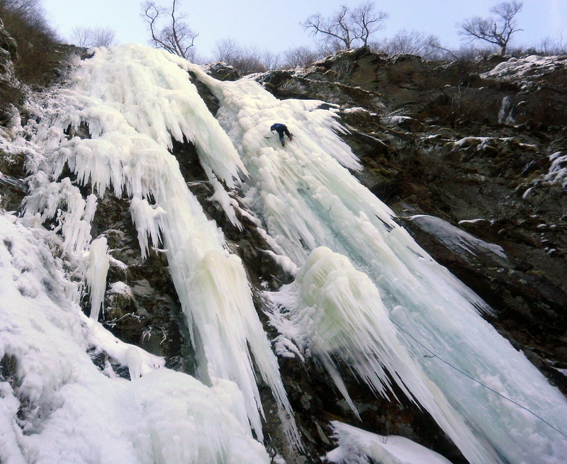 右のスラブは簡単そうだが氷が薄く、難しそうな氷柱の方にそそられた。